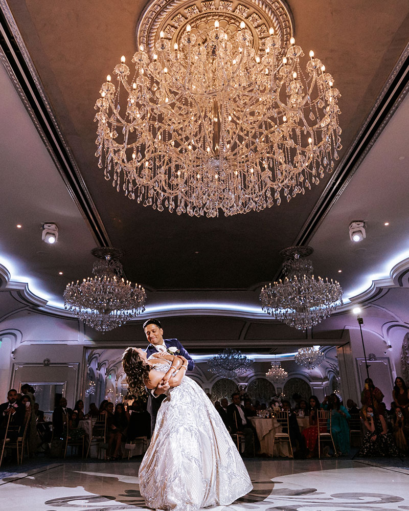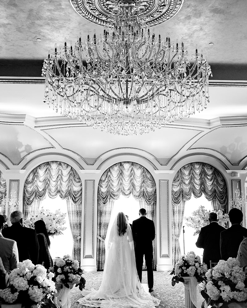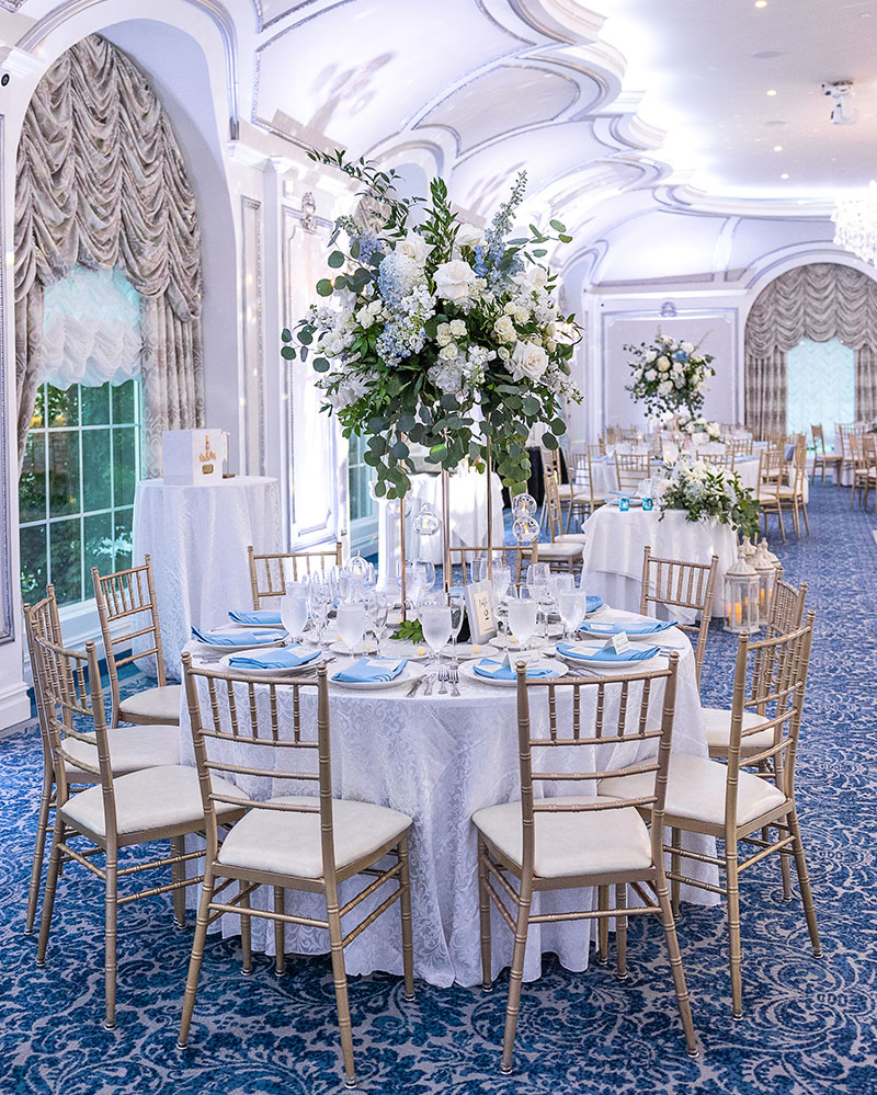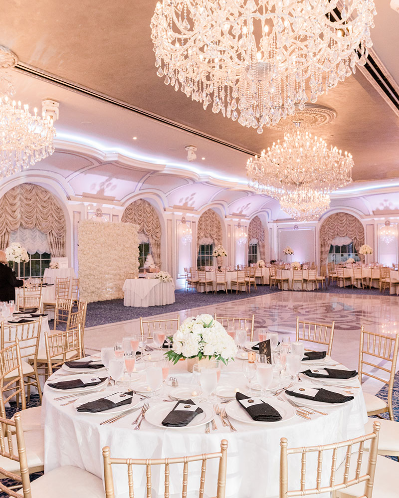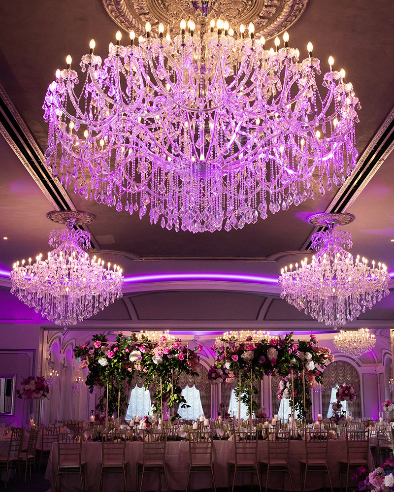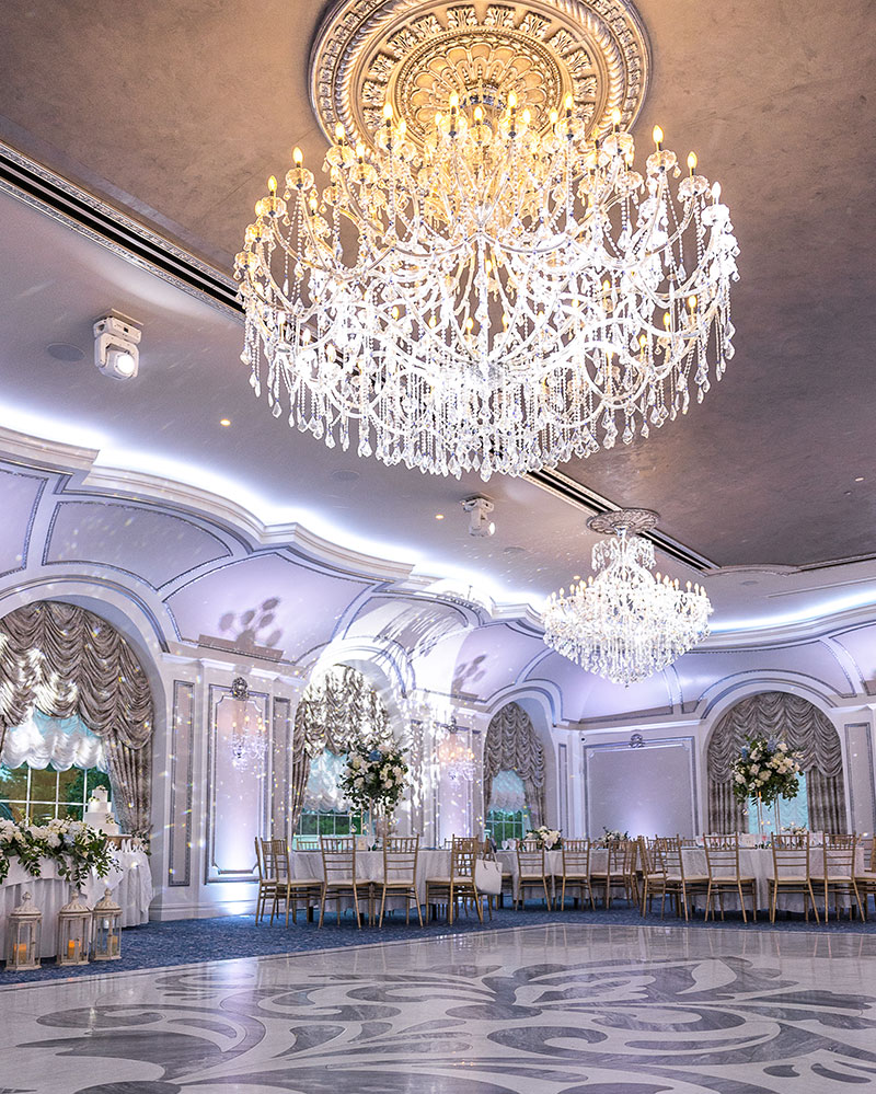 The Grand Ballroom distinguishes itself as the only ballroom with access to the outdoor patio and features a breathtaking custom marble dancefloor. Towering 16-foot ceilings adorned with sparkling crystal chandeliers, customizable up-lighting, and color-enhanced LED lighting along the platinum moldings on the ceiling add to the exquisiteness of this lavish room.